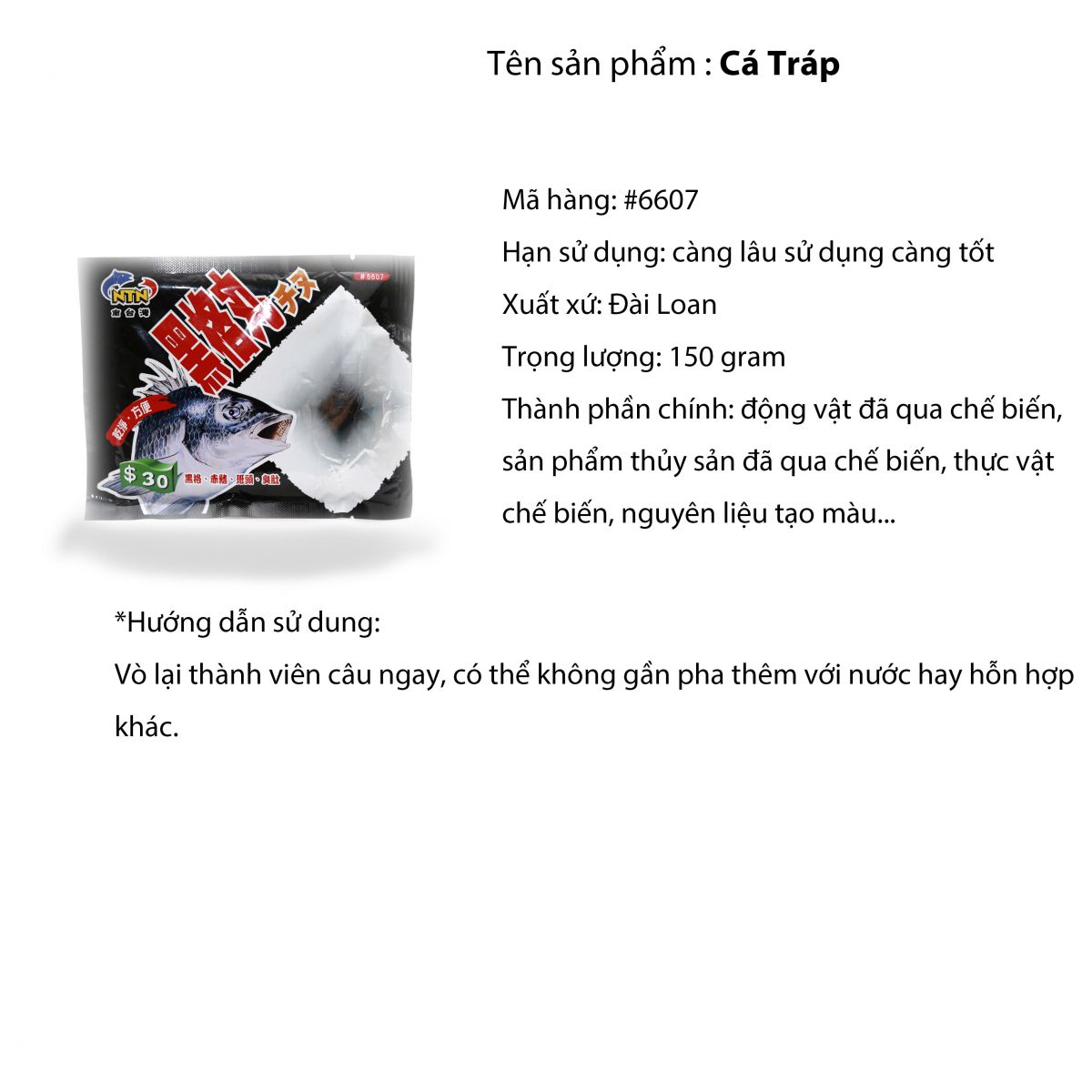 Cách sử dụng : Nhào trực tiếp sản phẩm này thành từng viên bột rồi vê mồi lên lưỡi câu để câu cá, rất tiện lợi.Để hiệu quả cao kết hợp dùng mồi xả cá tráp xả NTN trước khi câu sẽ mang lại hiệu quả cực kỳ cao.