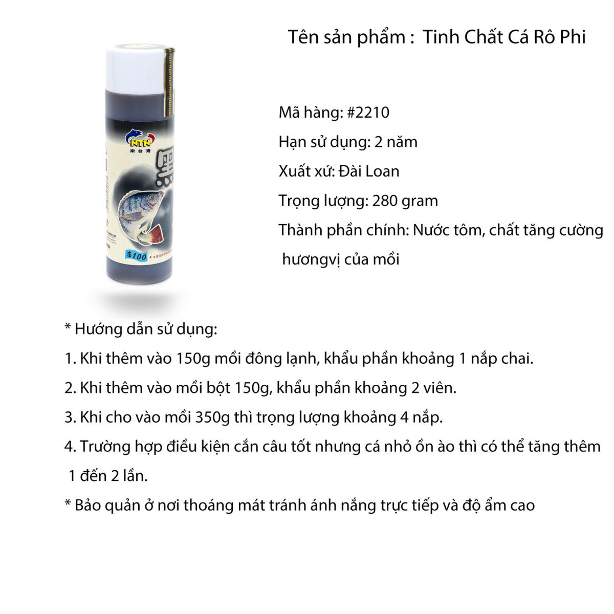 Công dụng: Đặc biệt dành cho cá rô phi câu lên thả xuống nhiều lần. Dùng để tăng hương vị và tác dụng của mồi câu cá.