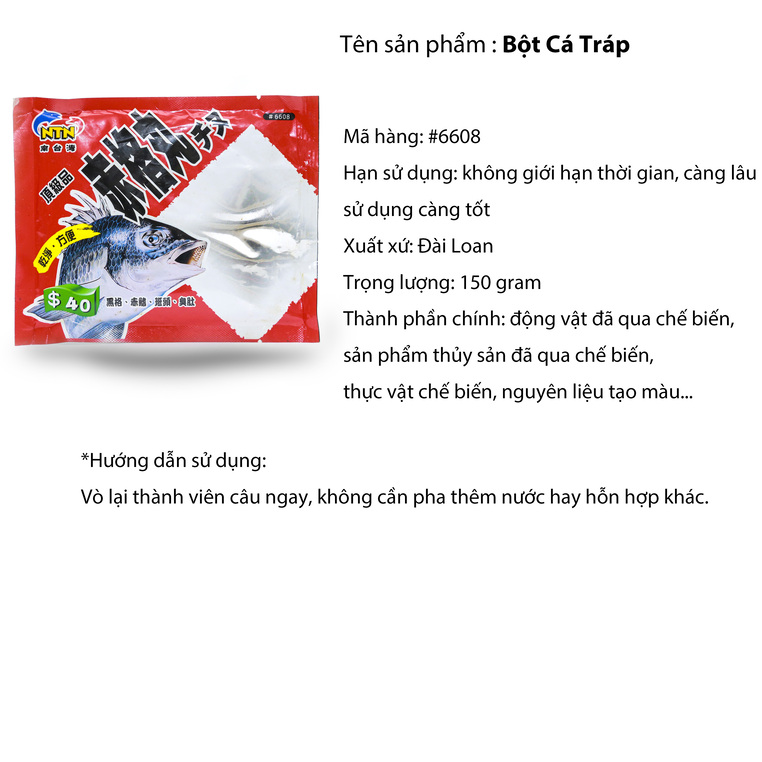 Cách sử dụng : Nhào trực tiếp sản phẩm này thành từng viên bột rồi vê mồi lên lưỡi câu để câu cá, rất tiện lợi.Để hiệu quả cao kết hợp dùng mồi xả cá tráp xả NTN trước khi câu sẽ mang lại hiệu quả cực kỳ cao.