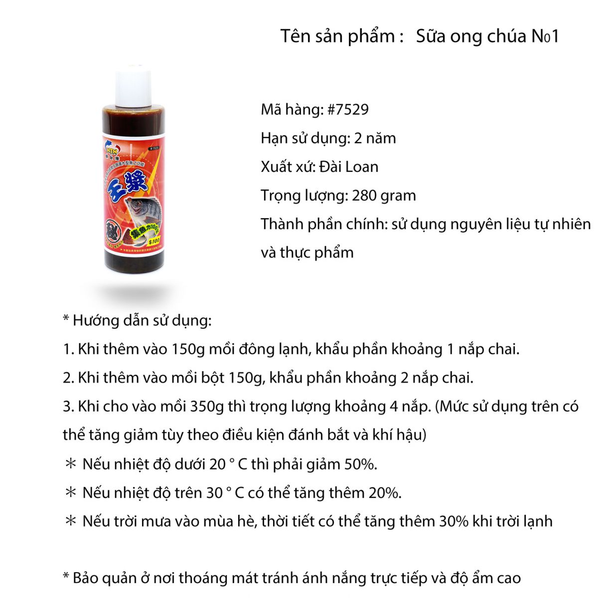 Công dụng: Tăng hương vị và tác dụng của mồi câu cáCách sử dụng: Chỉ cần trộn sản phẩm này với mồi câu cá. 1. Khi cho vào 150g mồi đông lạnh thì lượng khoảng 1 nắp chai. 2. Khi cho vào 150g mồi bột thì lượng khoảng 2 nắp chai. 3. Khi thêm vào 350g mồi thì lượng khoảng 4 nắp chai. (Lượng sử dụng trên có thể tăng hoặc giảm tùy theo điều kiện đánh bắt và khí hậu)*Nếu nhiệt độ dưới 20oC, trọng lượng phải giảm 50%*Nếu nhiệt độ cao hơn 30oC, mức tăng có thể tăng thêm 20%* Nếu trời mưa vào mùa hè hoặc thời tiết mát hơn, mức tăng có thể tăng thêm 30%.Xuất xứ : Đài Loan Trọng lượng : 280 gram